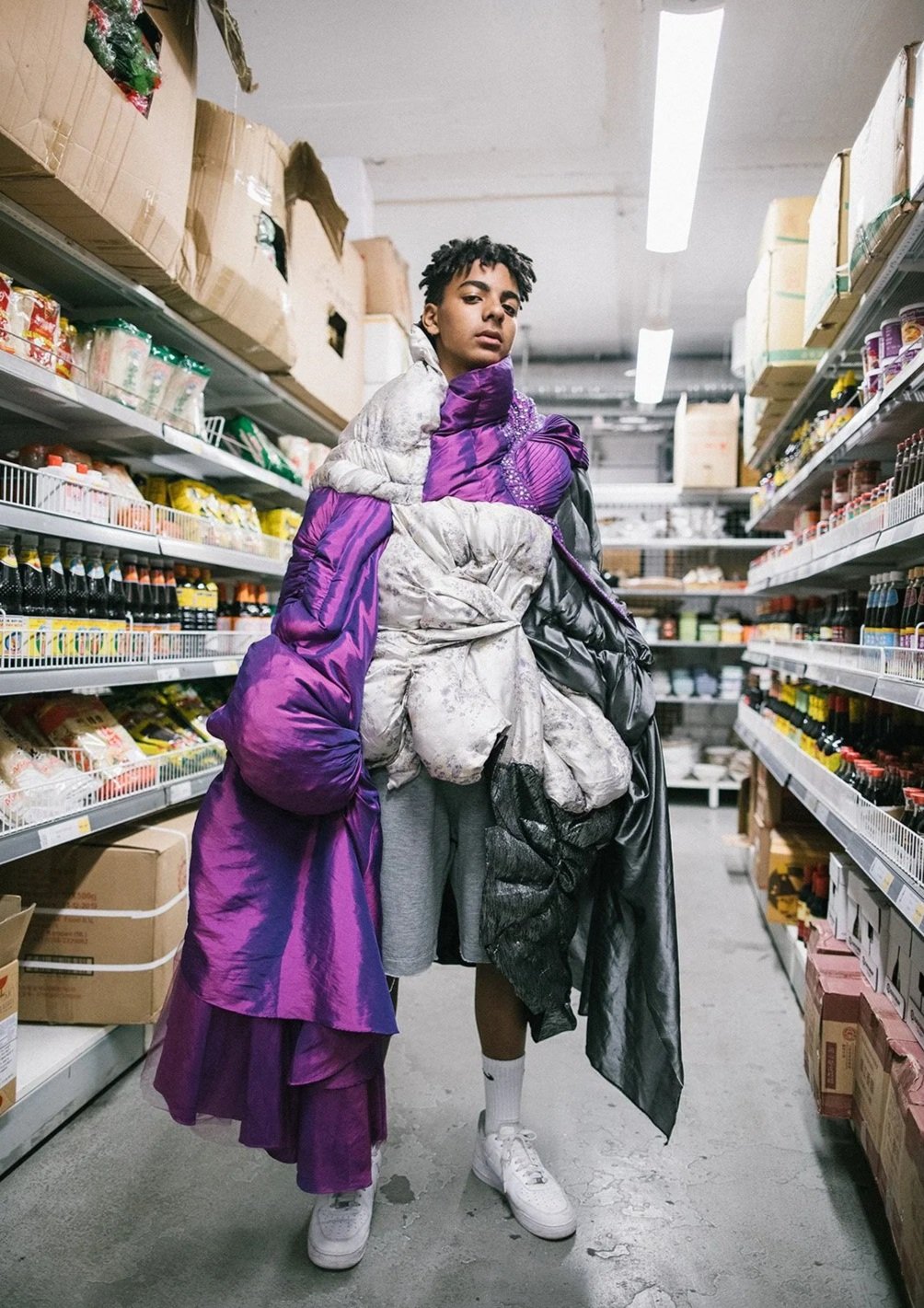 Transforming vintage dresses into sculptural streetwear.