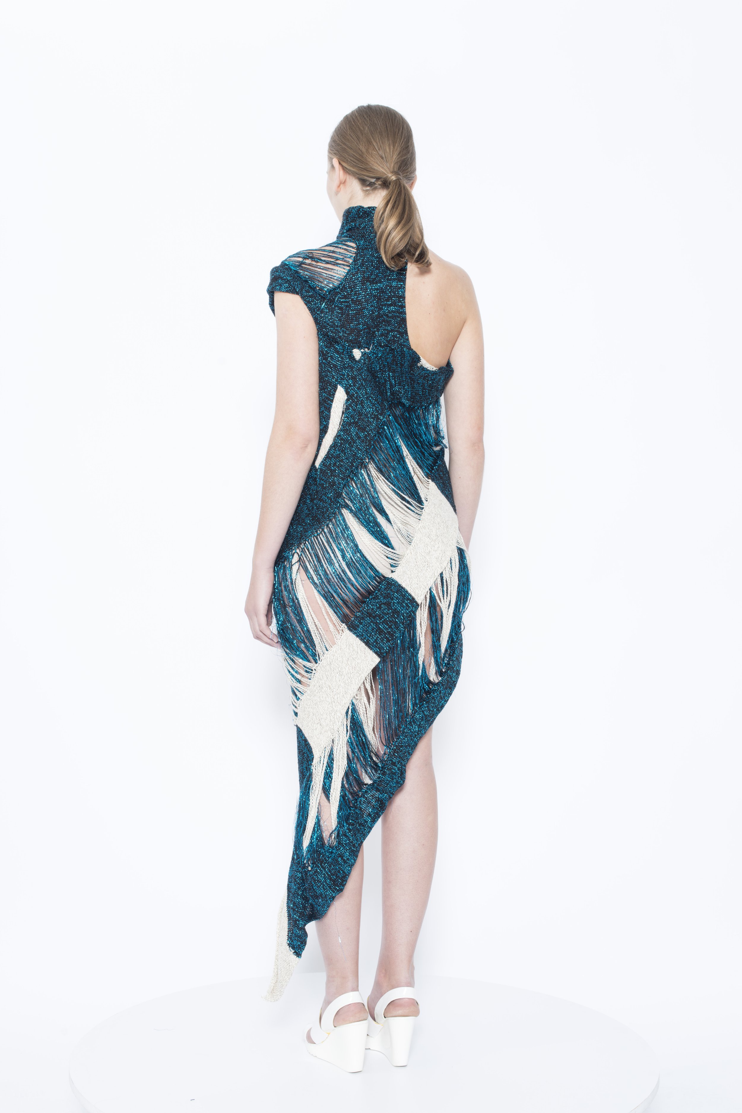 An exploration of knitting techniques and draping, created by simultaneously knitting two different materials into one continuous structure. Cotton and metallized yarn are joined through crossovers and mirrored turns, forming a single interconnected knit where each material relies on the other for balance and functionality.